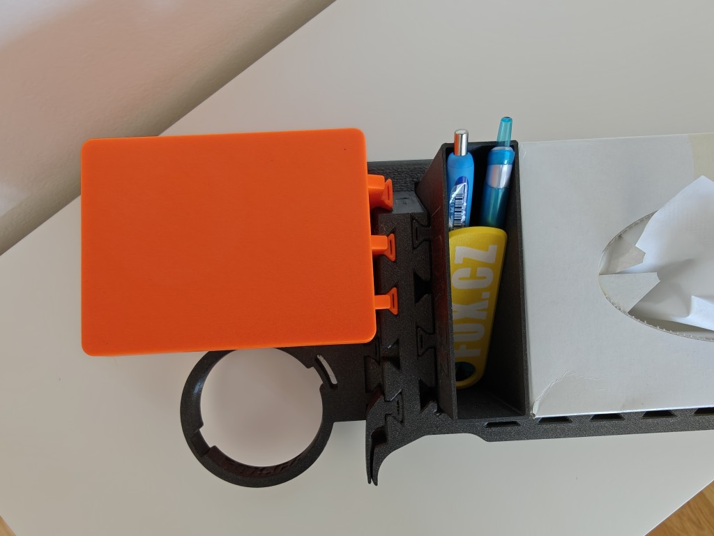 Waste bin for smaller waste. The bin and its lid are reversible, so it can be used on either the left or right side. It can also be used to store items as an additional box with a closing option.